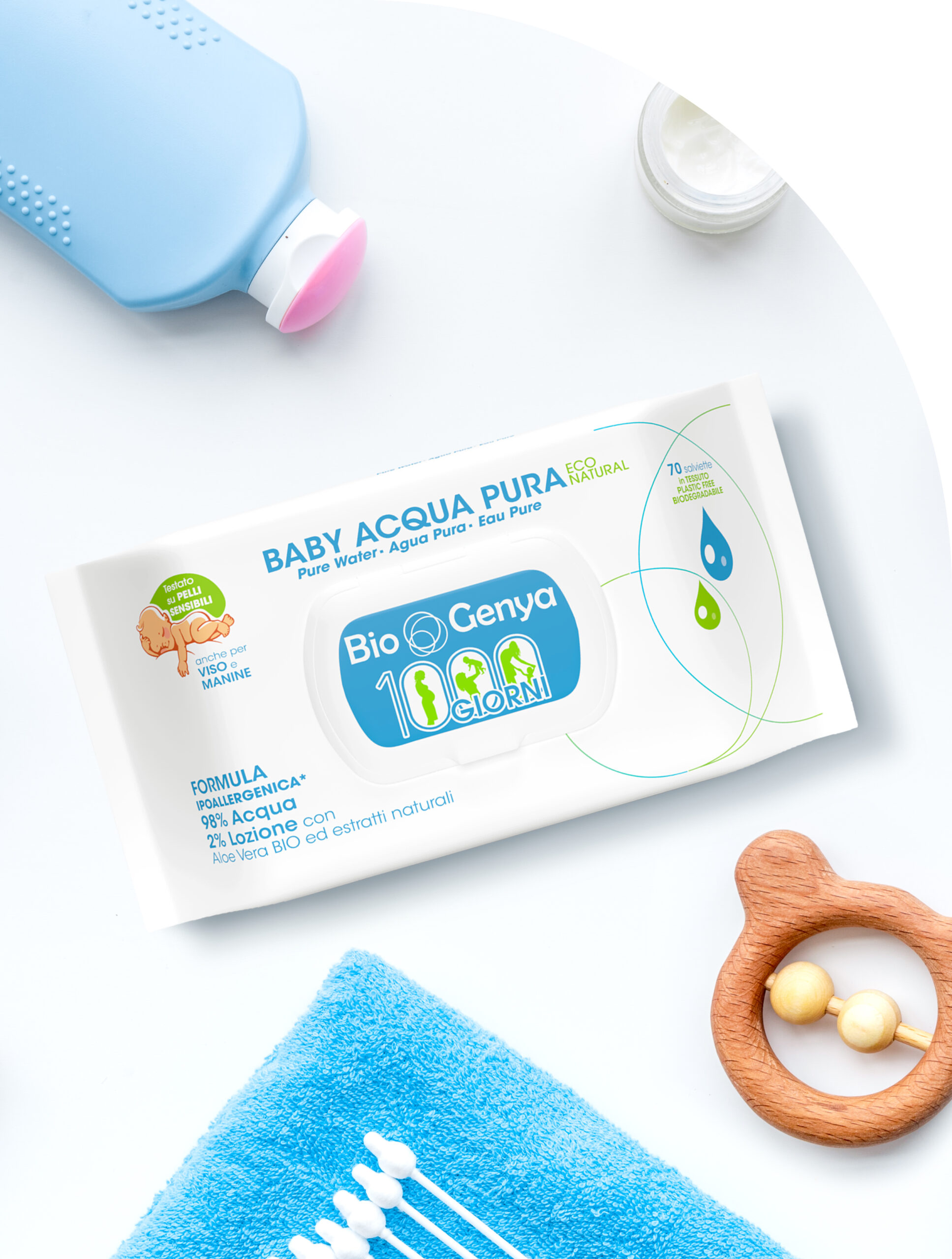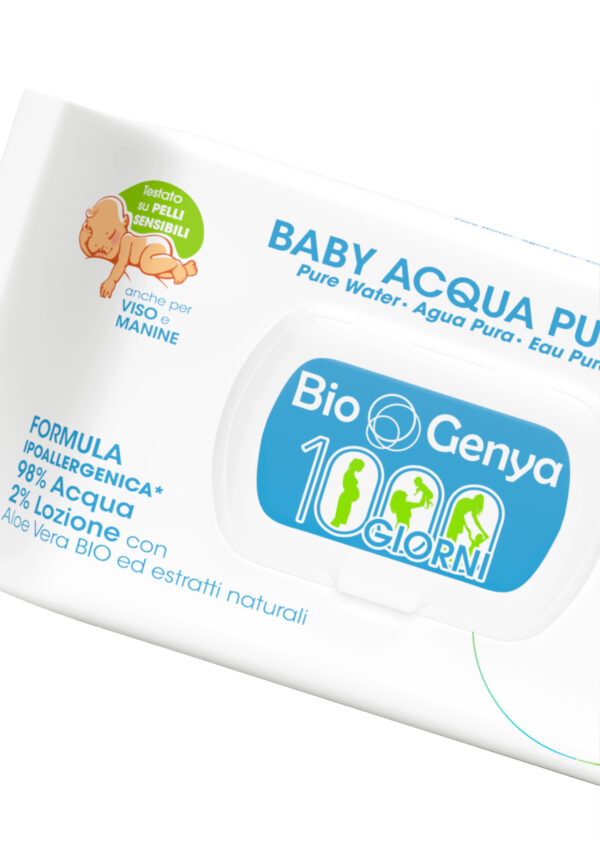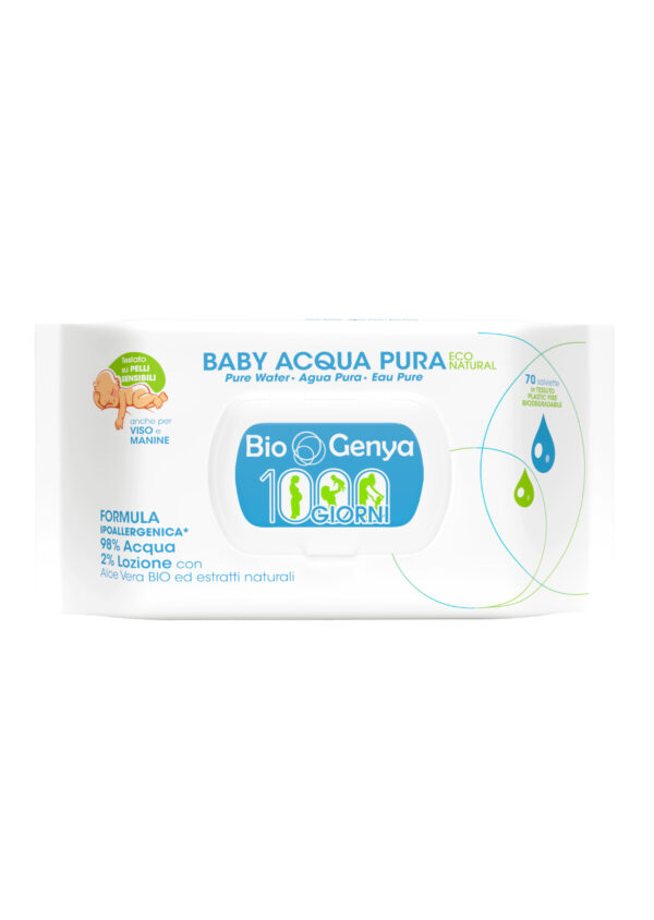 BioGenya 1000 giorni Salviette Eco Natural Acqua Pura per Neonato detergono in sicurezza la pelle di neonati e bambini. La speciale formulazione contiene solo il 98% di Acqua Pura e il 2% di Lozione (Aloe Vera Bio ed estratti naturali di acque aromatiche), garantisce una pelle morbida e pulita.